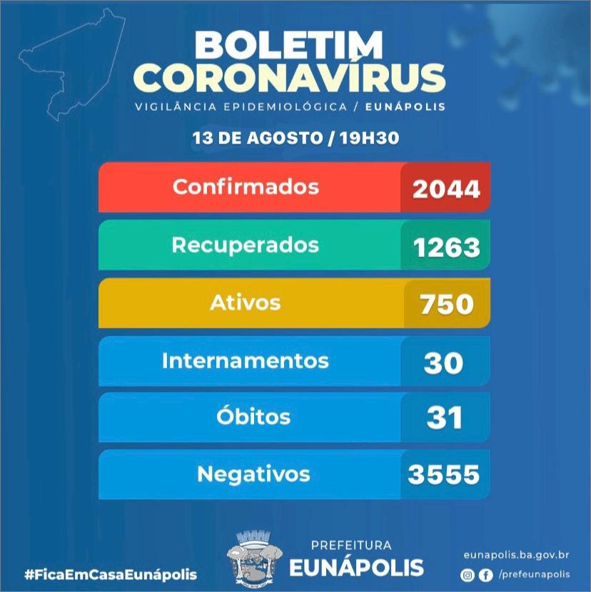 Nesta quinta-feira, 13, 04 pacientes receberam alta, estando agora RECUPERADOS do coronavírus. Hoje também tivemos 50 resultados NEGATIVOS e 41 POSITIVOS à Covid-19 (19 mulheres e 22 homens). Com isso, o município tem agora 2.044 pacientes confirmados ao novo coronavírus, sendo 1.263 já recuperados, 750 ativos (casos confirmados subtraídos os óbitos e os recuperados), 30 internamentos e 31 óbitos.