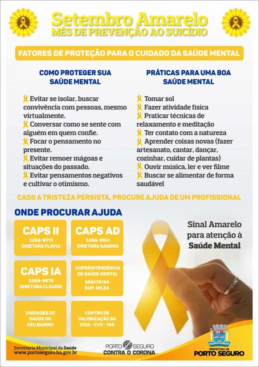 O Setembro Amarelo destaca-se pela mobilização sobre a prevenção do suicídio. Este ano, em meio à pandemia da covid-19, a Secretaria de Saúde de Porto Seguro reforça os impactos na saúde física e mental da população durante a doença que atingiu o mundo, afetando diretamente milhões de pessoas.