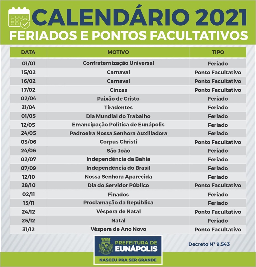 A Prefeitura de Eunápolis publicou nesta segunda-feira, 25, decreto que institui o calendário de feriados e pontos facultativos para o exercício 2021 nas unidades públicas municipais.