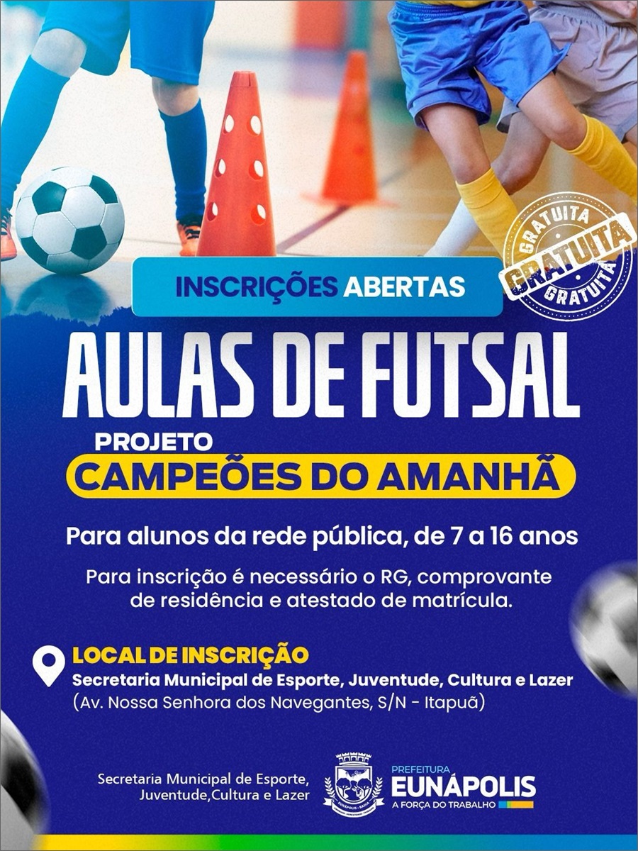 A Prefeitura de Eunápolis, por meio da Secretaria de Esporte, Cultura, Juventude e Lazer dá início a mais uma importante ação de incentivo ao esporte: as aulas gratuitas de futsal, destinadas exclusivamente a estudantes da rede pública municipal, com idades entre 07 e 16 anos.