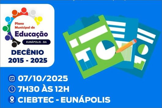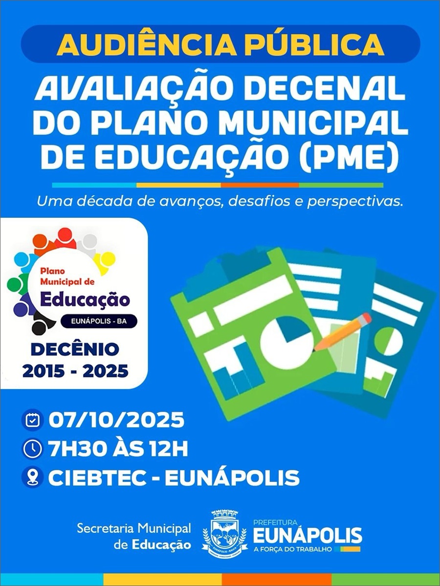 A Prefeitura de Eunápolis, por meio da Secretaria Municipal de Educação, realizará a Audiência Pública de Avaliação Decenal do Plano Municipal de Educação (PME), cumprindo o que determina a Lei Federal nº 13.005/2014 (PNE) e a Lei Municipal nº 986/2015. A iniciativa integra o processo legal de monitoramento e avaliação periódica das metas educacionais, com ampla divulgação dos resultados.