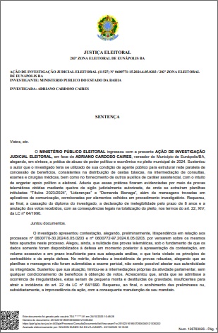 O advogado Jota Batista acaba de conquistar uma decisão histórica na Justiça Eleitoral de Eunápolis. O vereador Adriano Cardoso foi absolvido de todas as acusações em uma Ação de Investigação Judicial Eleitoral (AIJE) movida pelo Ministério Público do Estado da Bahia, que o acusava de suposto abuso de poder político e econômico nas eleições municipais de 2024.