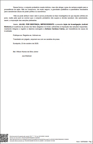 A sentença, proferida em 23 de outubro de 2025, foi considerada inédita no âmbito da Justiça Eleitoral local, por firmar entendimento de que ações sociais de caráter contínuo e desvinculadas de campanha eleitoral não configuram abuso de poder.
