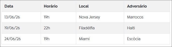 Na segunda rodada, o Brasil volta a campo no dia 19 de junho, quando encara o Haiti no Lincoln Financial Field, na Filadélfia, às 22h (horário de Brasília). Já o encerramento da primeira fase está marcado para o dia 24 de junho, contra a Escócia, no Hard Rock Stadium, em Miami, também às 19h (horário de Brasília).