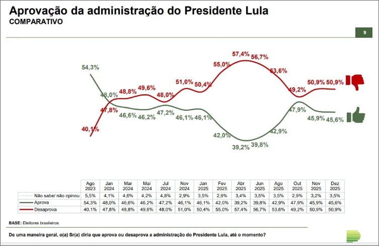 Apesar de a desaprovação ser maior do que a aprovação, há uma estabilidade em relação aos números de novembro (veja quadro abaixo). A situação já foi pior: o recorde negativo do petista foi registrado em abril de 2025, quando 57,4% dos eleitores afirmaram desaprovar o terceiro mandato presidencial de Lula. Já o