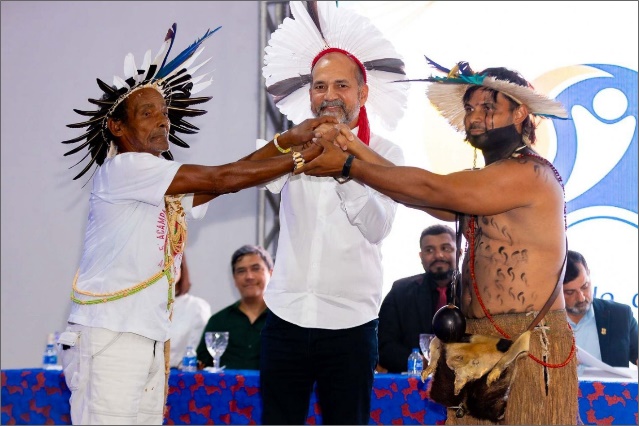 INVESTIMENTO E HOMENAGENS - Robério destacou que o Município está investindo na aquisição de novos parquinhos infantis, na substituição do mobiliário e na reforma das quadras esportivas, que já estão recebendo pisos modulares, e das unidades educacionais, que em breve serão contempladas com usinas solares fotovoltaicas. Na ocasião, o gestor também foi homenageado com a entrega de um cocar pelo cacique Tupinambá David Piatã Gonçalves de Medeiros, representante das aldeias Taquari e Teiú-Açú, gesto que simbolizou respeito e fortalecimento da parceria com os povos originários.