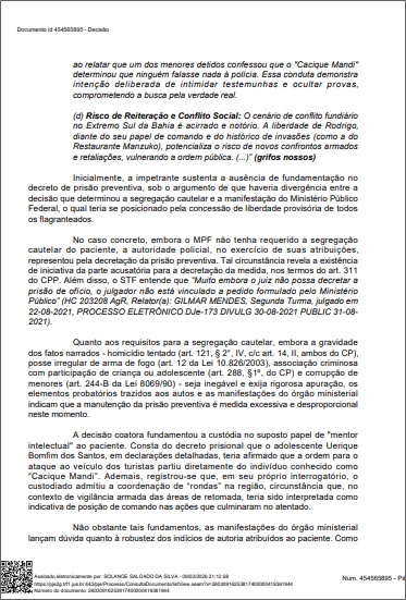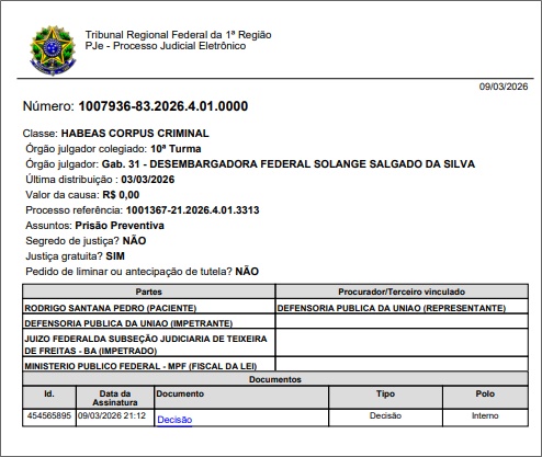 Além disso, a defesa alegou que era injusto manter o "mentor" preso enquanto os supostos atiradores (executores diretos) já tinham sido soltos pela justiça. Foi ressaltado ainda que Rodrigo é bolsista de pesquisa da Universidade Federal do Sul da Bahia (UFSB) e possui histórico de liderança diplomática, o que pesou a seu favor.
