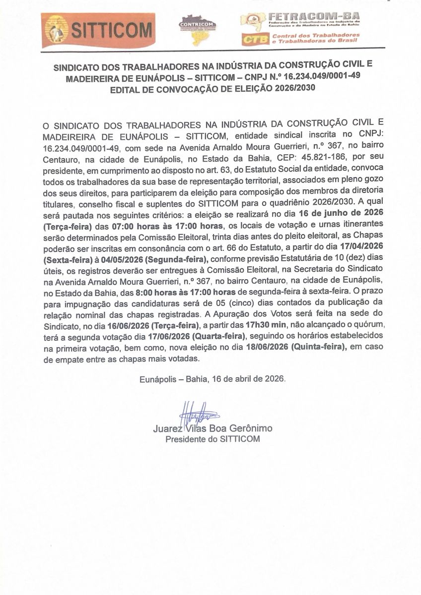 Sindicato dos Trabalhadores na Indústria Civil e Madeireira de Eunápolis publica Edital de Convocação de Eleição