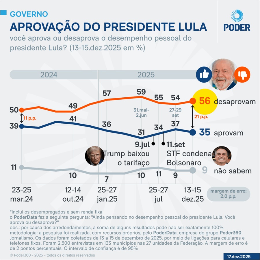 As taxas de aprovação e de desaprovação do presidente Luiz Inácio Lula da Silva (PT) voltaram ao patamar de janeiro de 2025, de acordo com a pesquisa PoderData realizada de 13 a 15 de dezembro. Houve variação negativa desde setembro nas avaliações do petista e de seu governo (leia no infográfico mais abaixo), ainda que dentro da margem de erro (2 pontos percentuais).