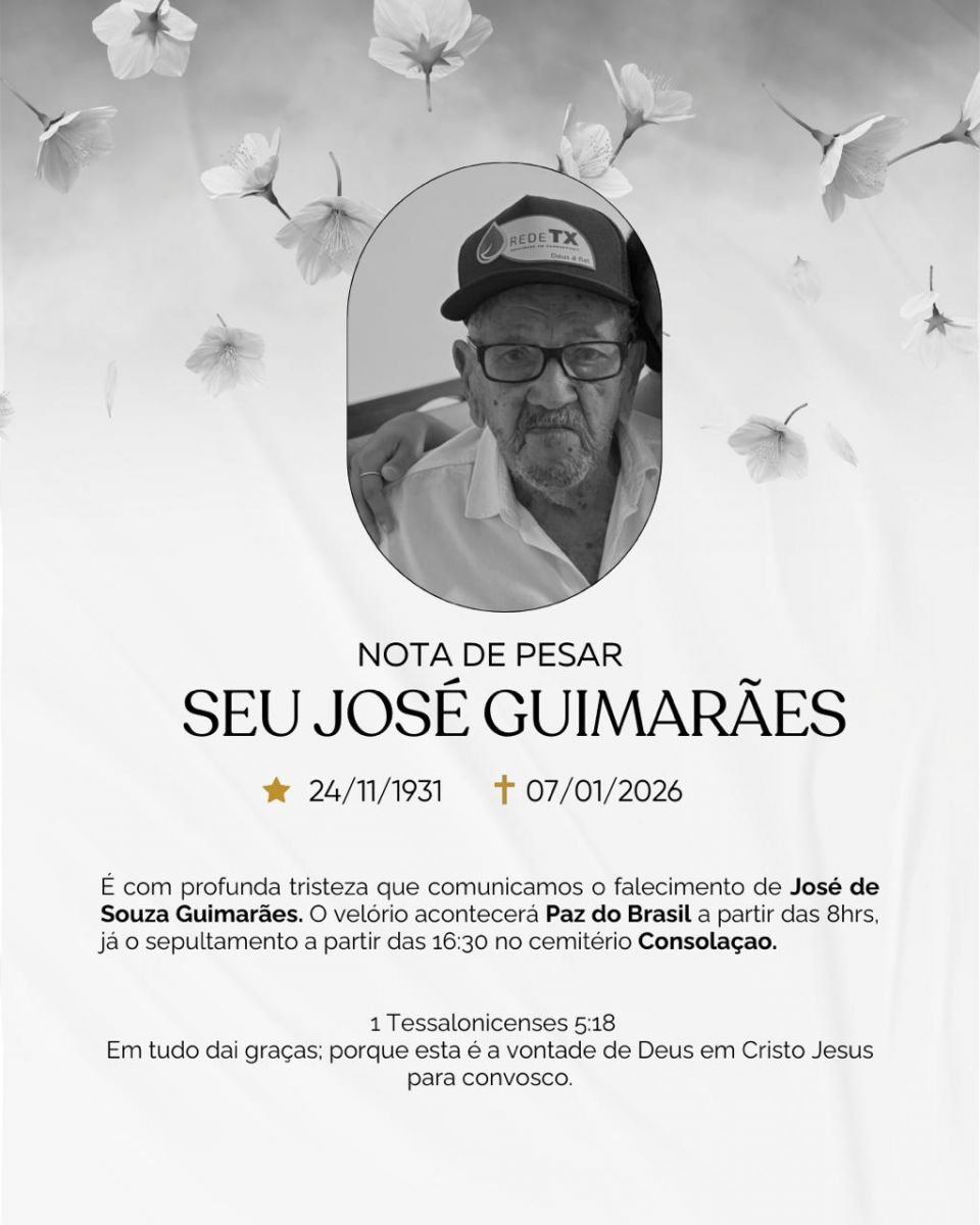 Nascido em 24 de novembro de 1931, Seu José era uma figura querida na região, tendo completado recentemente 94 anos de uma vida dedicada à família e ao trabalho. Em nota, familiares expressaram profunda tristeza e destacaram a fé que o acompanhou por toda a jornada, citando o versículo bíblico de 1 Tessalonicenses 5:18: "Em tudo dai graças; porque esta é a vontade de Deus em Cristo Jesus para convosco".