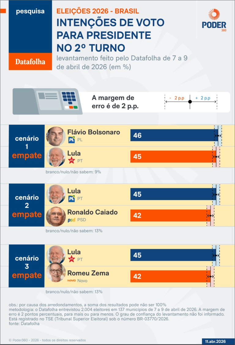 Como a margem de erro é de 2 pontos percentuais para mais ou para menos, todos esses cenários configuram empates. A pesquisa Datafolha ouviu 2.004 eleitores em 137 cidades de 3ª feira (7.abr) a 5ª feira (9.abr). Está registrada no TSE (Tribunal Superior Eleitoral) com o código BR03770/2026.