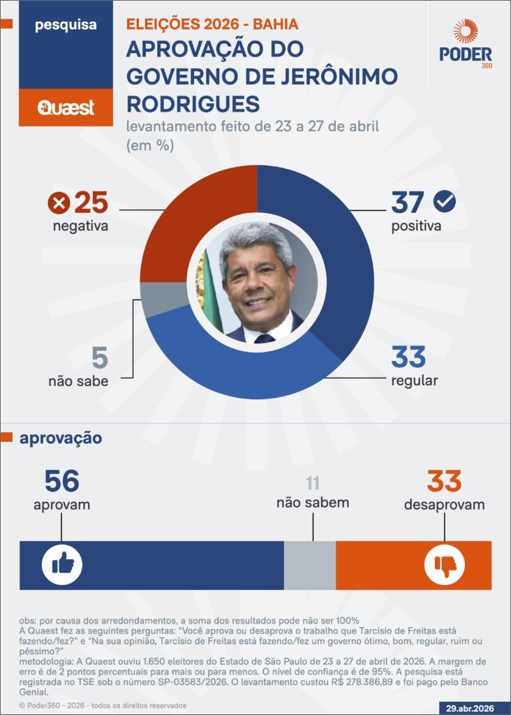 Levantamento da Quaest divulgado nesta 4ª feira (29.abr.2026) mostra que 56% dos eleitores na Bahia aprovam a gestão do governador Jerônimo Rodrigues (PT), enquanto 33% desaprovam. Outros 11% não souberam opinar.