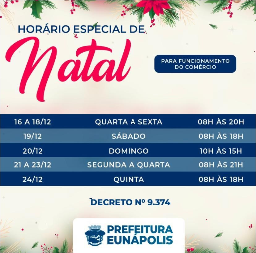 Entre os dias 16 e 18 de dezembro, o comércio funcionará das 8h às 20h. Dia 19/12 das 08h às 18h. Dia 20/12 das 10h às 15h. De 21 a 23/12 das 08h às 21h. Já na véspera de Natal, dia 24, os estabelecimentos funcionarão das 08h às 18h.