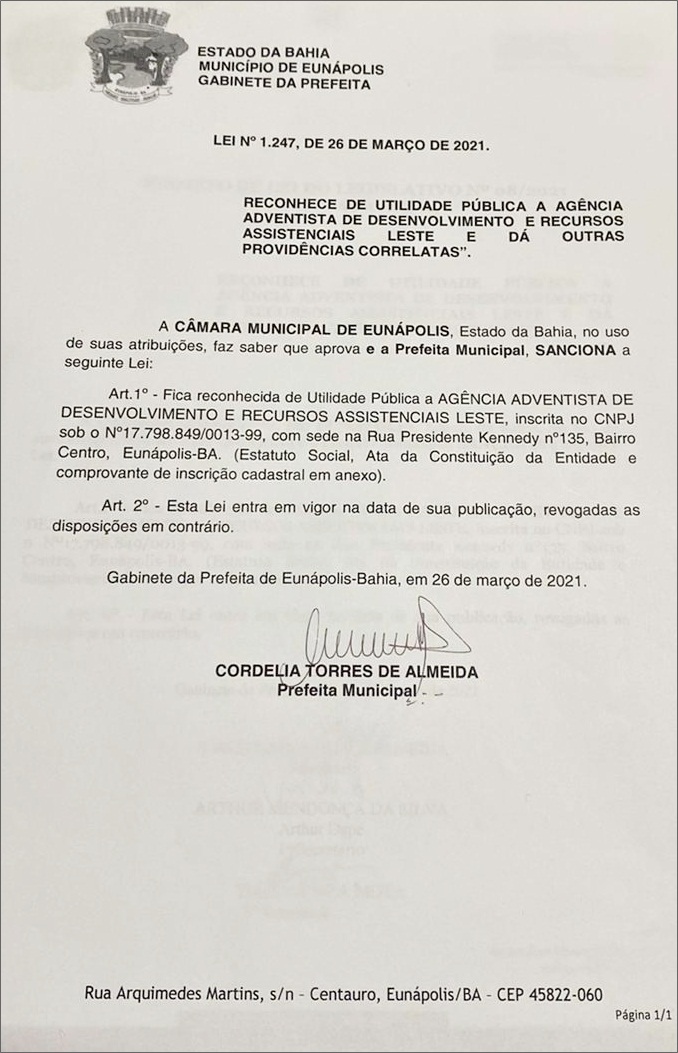 A prefeita de Eunápolis, Cordélia Torres, sancionou no último dia 26, lei reconheceu a Agência Adventista de Desenvolvimento e Recursos Assistenciais (Adra) como de utilidade pública. O projeto de lei foi aprovado pelo plenário da Câmara Municipal e agora foi sancionada pelo Poder Executivo Municipal.
