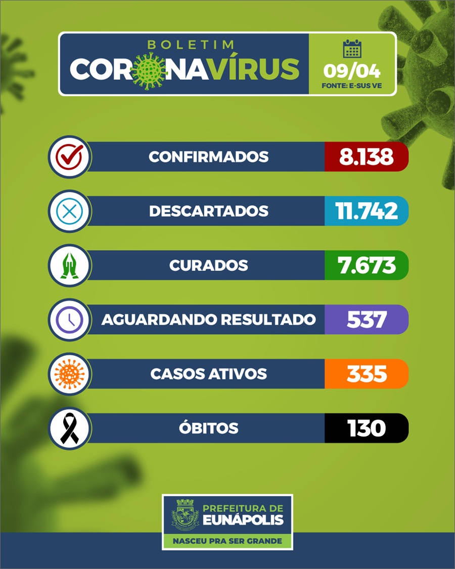 É com grande pesar que informamos a confirmação de mais 03 óbitos. O município tem hoje 8.138 pacientes confirmados com o novo coronavírus, sendo 7.673 já recuperados, 335 ativos (casos confirmados subtraídos os óbitos e os recuperados) e 130 óbitos. O município segue com 03 óbitos sob investigação.