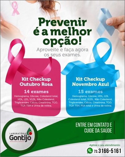 Para ampliar o acesso aos exames preventivos, o Laboratório Gontijo criou dois kits para o checkup de mulheres e homens, com descontos especiais, que vão ficar em vigor até o fim de novembro. No “Kit Outubro Rosa”, são oferecidos 14 exames diferentes, que incluem Hemograma, Glicose, Colesterol total, HDL, LDL, VLDL, Não Colesterol, Triglicérides, Cálcio, Creatinina, TGO, TGP, TSH e Urina de rotina.