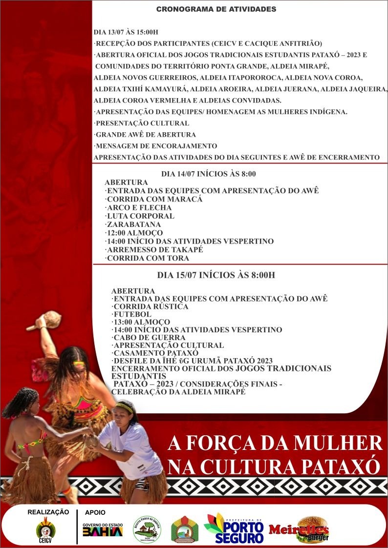 Começam nesta quinta-feira, 13/07, os Jogos Tradicionais Estudantis Pataxó, na Aldeia Mirapé, na Ponta Grande, reunindo centenas de atletas, representantes da comunidade, lideranças indígenas e dos governos municipal e estadual. Em sua segunda edição, os jogos se consolidam como mais uma importante ação cultural, histórica e esportiva dos indígenas pataxó em Porto Seguro.