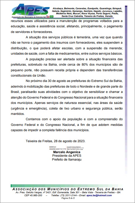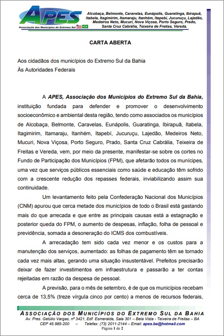 A Carta Aberta divulgada nesta segunda-feira, 28, pela Apes (Associação dos Municípios do Extremo Sul, sob o argumento de que estão pagando mais do que arrecada, e culpando o Governo Federal pelas quedas nos repasses do FPM, não sensibiliza a imprensa e nem as populações sofridas desta região.