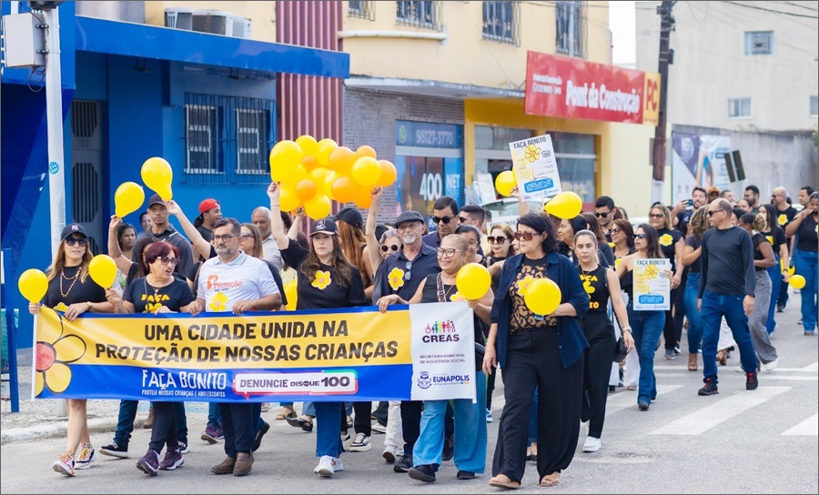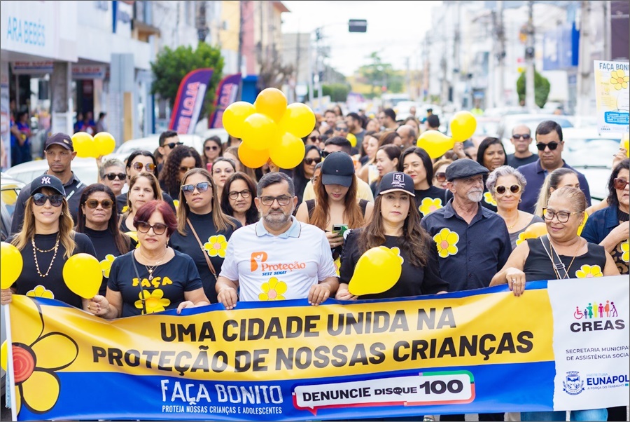 Em um forte ato de conscientização contra o abuso e a exploração sexual de crianças e adolescentes, a Prefeitura de Eunápolis, por meio da Secretaria Municipal de Assistência Social, promoveu na manhã desta sexta-feira (23) uma caminhada alusiva à campanha nacional “Faça Bonito”. A mobilização percorreu a Avenida Porto Seguro, no centro da cidade, e reuniu ampla participação da sociedade civil e do poder público.
