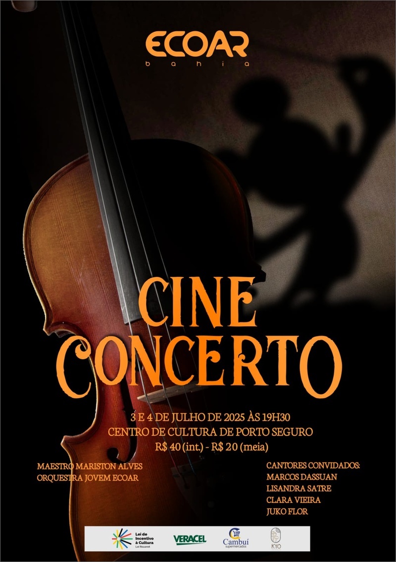 O Projeto Ecoar Bahia realiza, nos dias 3 e 4 de julho, no Centro de Cultura de Porto Seguro, o Cine Concerto com a Orquestra Jovem ECOAR. O espetáculo ocorre as 19h30 e reunirá trilhas sonoras icônicas do cinema, interpretadas por jovens músicos da região Sul da Bahia, em uma apresentação emocionante que celebra a arte e a força da transformação social por meio da cultura.