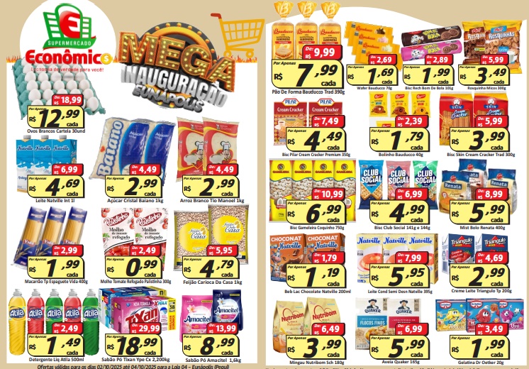 Atenção, Eunápolis e região! Atenção, donas de casa. É nesta quinta-feira, 2 de outubro, a mega-inauguração do Supermercado Econômico, em Eunápolis, no antigo Andradão, endereço Avenida Cristóvão Colombo, 1003, no Pequi.