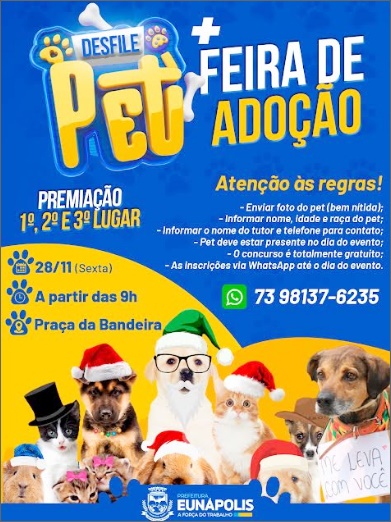 A Prefeitura de Eunápolis, por meio da Unidade de Vigilância de Zoonoses (UVZ), realiza nesta sexta-feira (28) a 2ª Grande Feira PET, das 9h às 17h, na Praça da Bandeira. A ação reúne serviços essenciais para tutores e incentiva a adoção responsável de animais.
