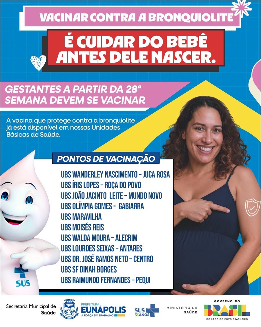 Desde quarta-feira (10), a vacina contra a bronquiolite já está disponível nas Unidades Básicas de Saúde (UBSs) de Eunápolis para gestantes a partir da 28ª semana. A aplicação é em dose única e deve ser repetida em cada nova gestação, garantindo proteção ao bebê nos primeiros seis meses de vida, período em que há maior risco de complicações respiratórias.