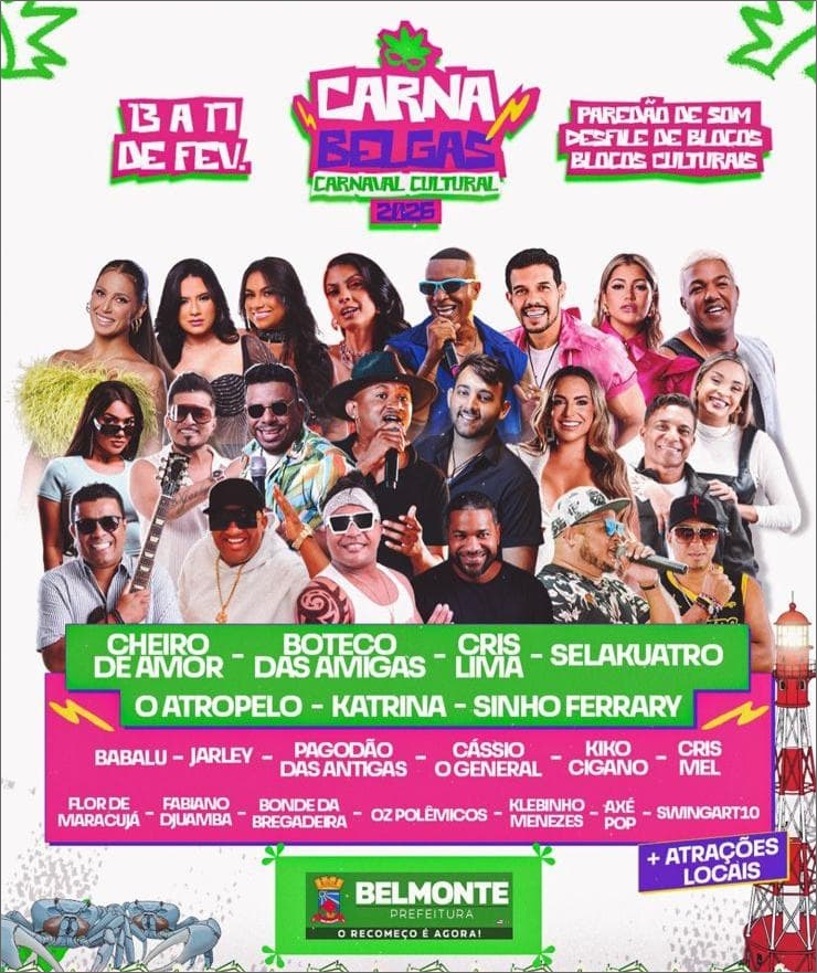 Grandes atrações estarão se apresentando na festa de momo, entre os dias 13 e 17. Artistas renomados como a Banda Cheiro de Amor, Boteco das Amigas, Cris Lima, Katrina, Sinhô Ferrary, O Atropelo, e mais uma dezena de artistas conhecidos como Jarley, Axé Pop, e outros farão os foliões agitarem a avenida.