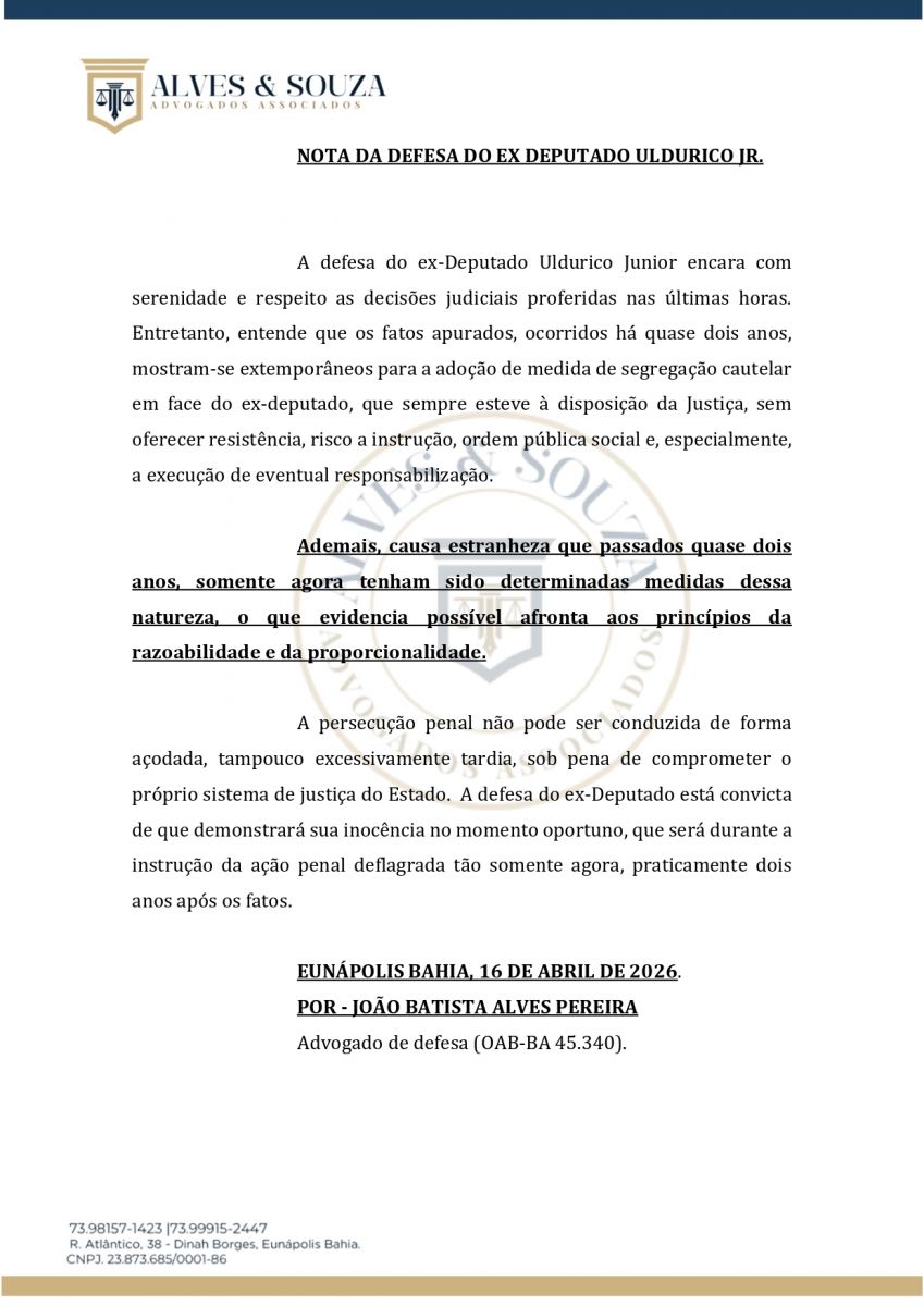 O advogado de defesa do ex-deputado federal Uldurico Júnior publicou na tarde desta quinta-feira, 16, Nota Pública com os devidos esclarecimentos a respeito das decisões judiciais.
