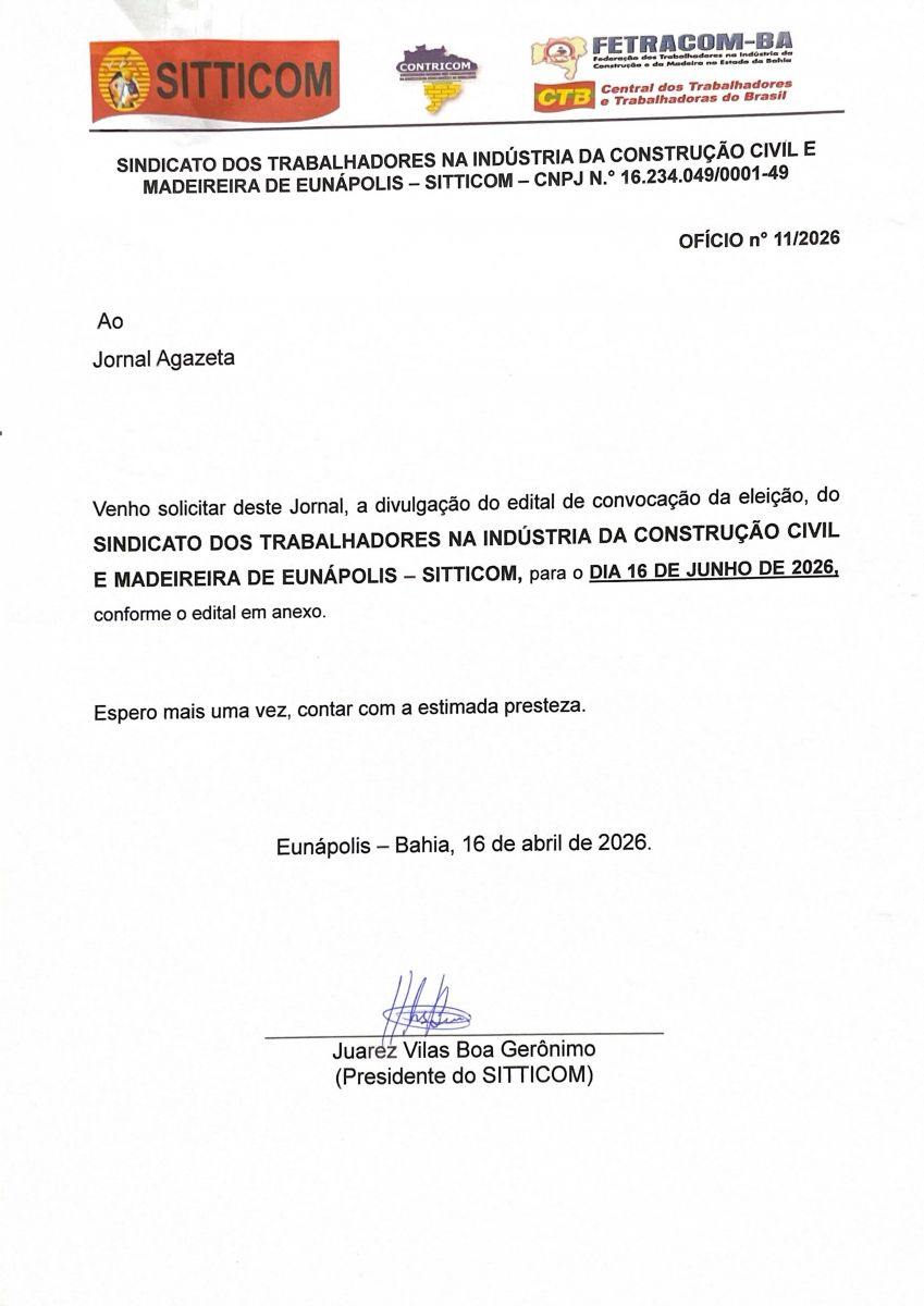 Sindicato dos Trabalhadores na Indústria Civil e Madeireira de Eunápolis publica Edital de Convocação de Eleição
