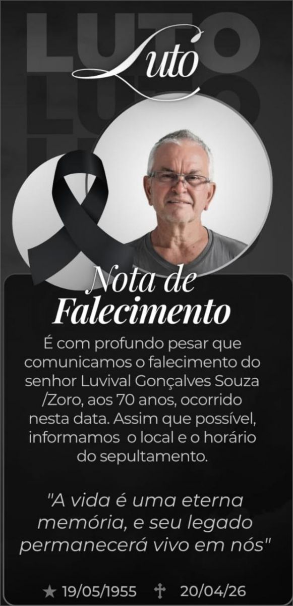 Faleceu o empresário e pioneiro do setor de guinchos, na cidade de Eunápolis, Luvinal Gonçalves, aos 70 anos, conhecido por Zoro do Guincho, vítima de enfarto, embora estivesse internado em unidade hospitalar há cerca de três meses.